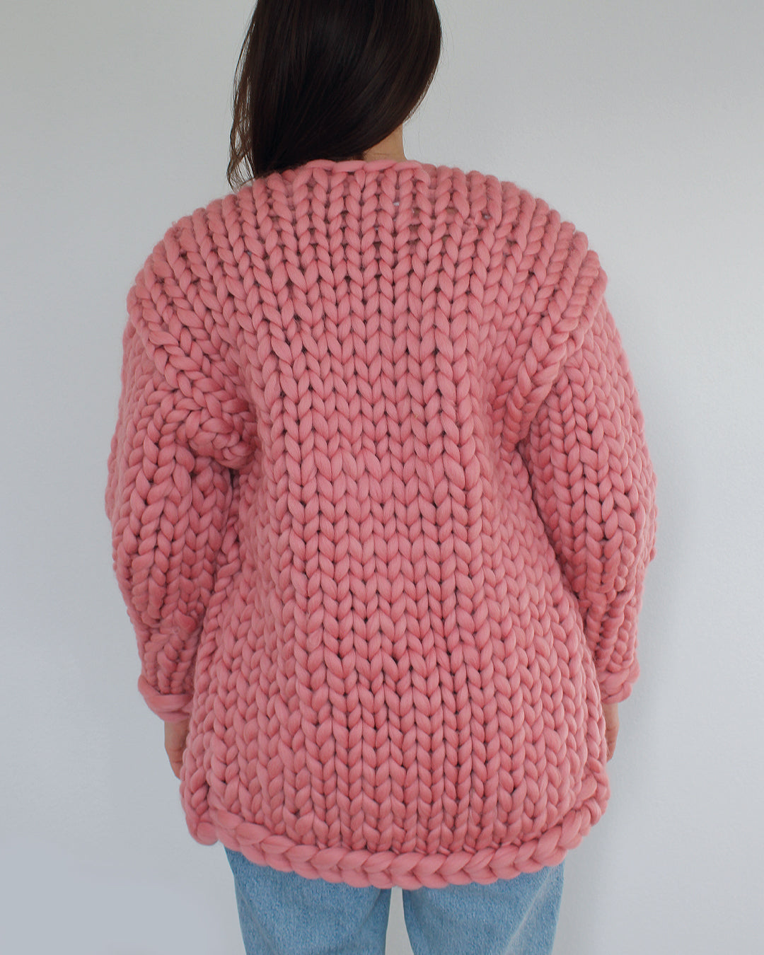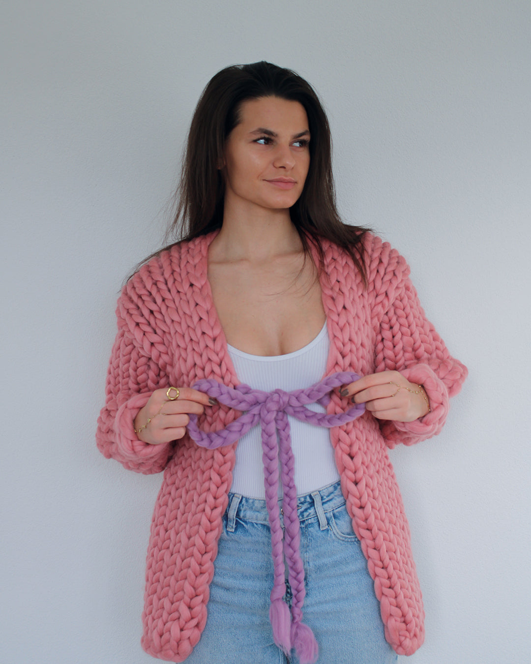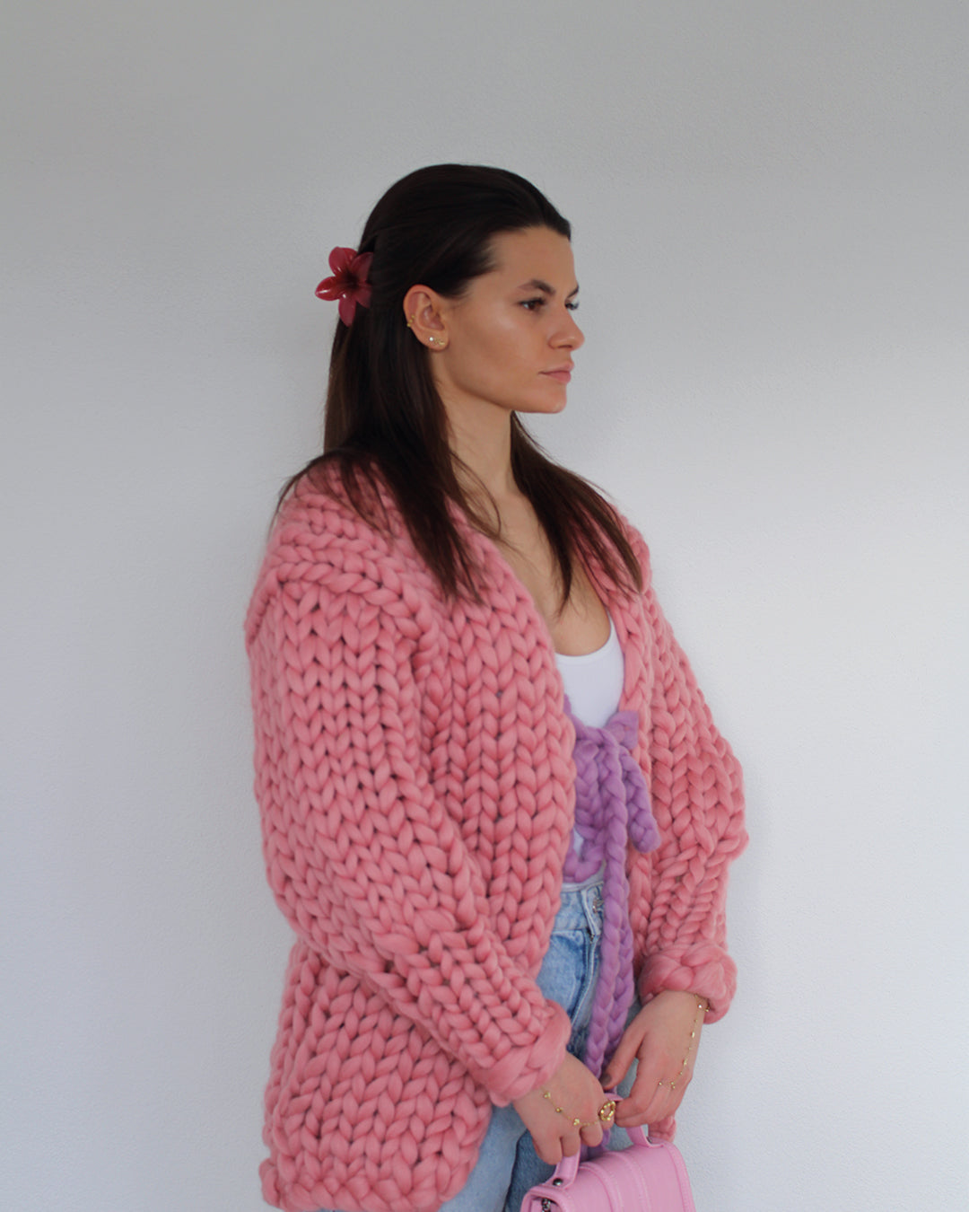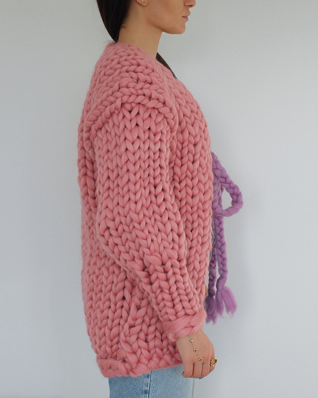 This cozy, 100% Merino Wool cardigan is a true wardrobe essential. Our I'm just a girl Knit Cardigan design comes in a playful combo of pink and purple, adding a touch of vibrancy to any outfit. The chunky knit is entirely handmade, showcasing the warmth and softness of premium wool. Featuring a relaxed, boxy fit and voluminous balloon sleeves, this cardigan offers both comfort and style, making it perfect for layering during cooler months. A timeless piece that combines craftsmanship with effortless chic.