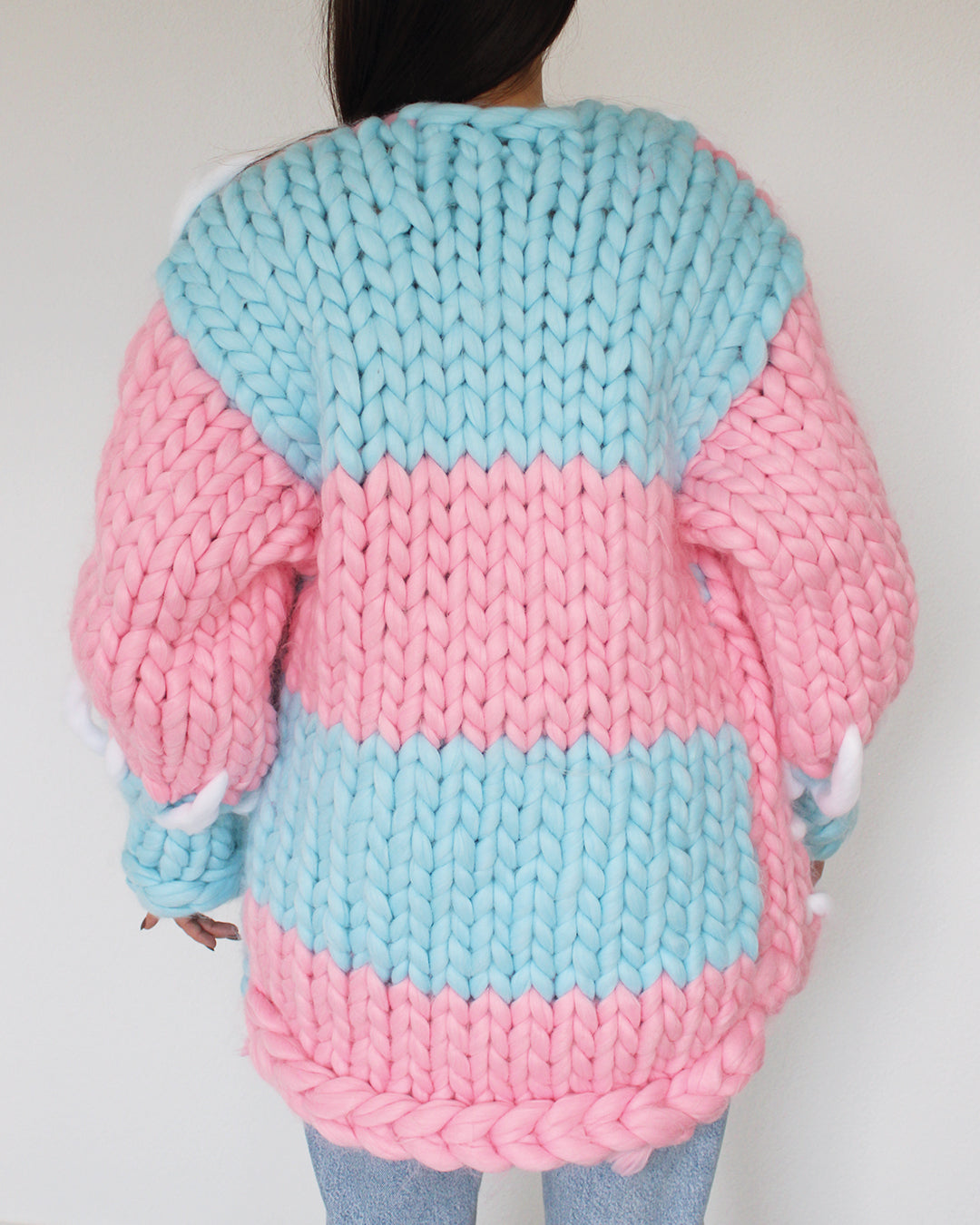 This cozy, 100% premium acrylic cardigan is a true wardrobe essential. Our Spring Collection cardigan design comes in a playful combo of pink and blue, adding a touch of vibrancy to any outfit. The chunky knit is entirely handmade, showcasing the warmth and softness of premium wool. Featuring a relaxed, boxy fit and voluminous balloon sleeves, this cardigan offers both comfort and style, making it perfect for layering during cooler months. A timeless piece that combines craftsmanship with effortless chic.