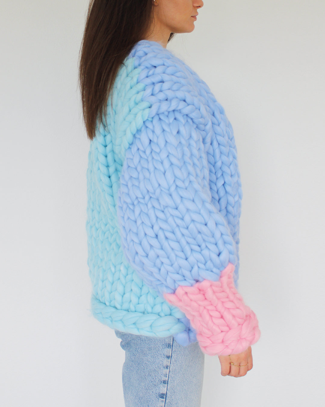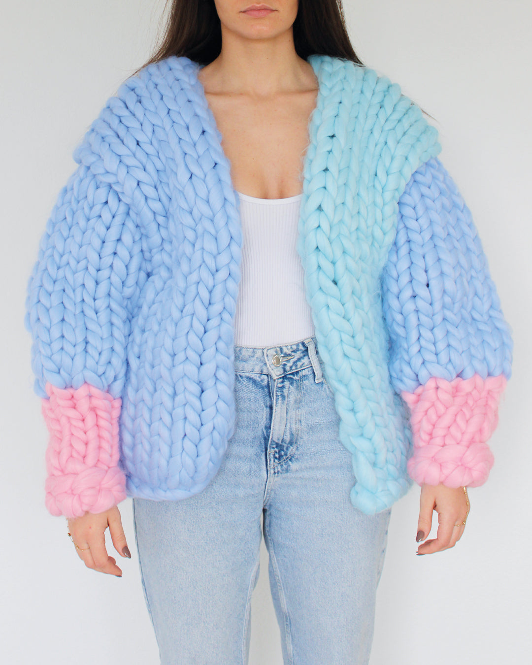 This cozy, 100% premium acrylic cardigan is a true wardrobe essential. Our Spring Collection cardigan design comes in a playful combo of colors, adding a touch of vibrancy to any outfit. The chunky knit is entirely handmade, showcasing the warmth and softness of premium wool. Featuring a relaxed, boxy fit and voluminous balloon sleeves, this cardigan offers both comfort and style, making it perfect for layering during cooler months. A timeless piece that combines craftsmanship with effortless chic.